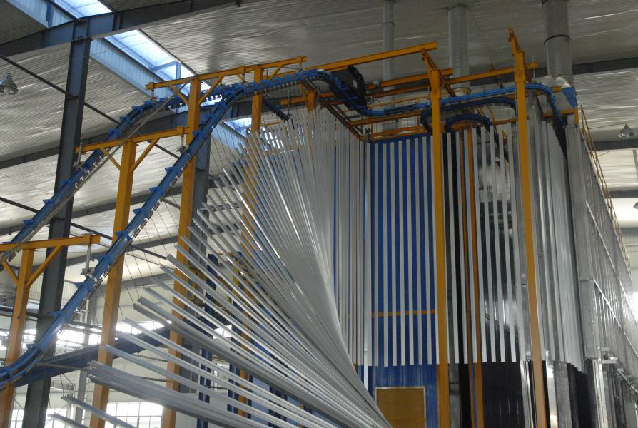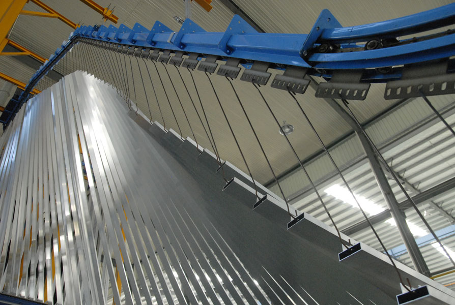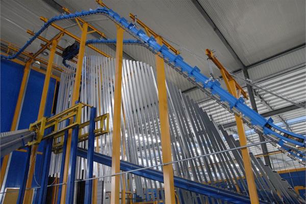 Il convogliatore aereo monorotaia X45-01 è un sistema di trasporto progettato da CM Automazione per una linea di verniciatura profili in alluminio.
