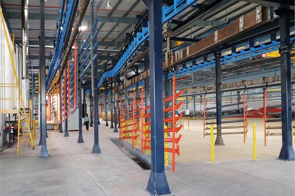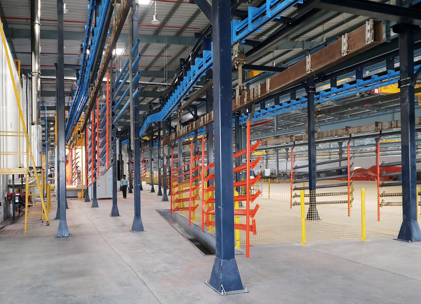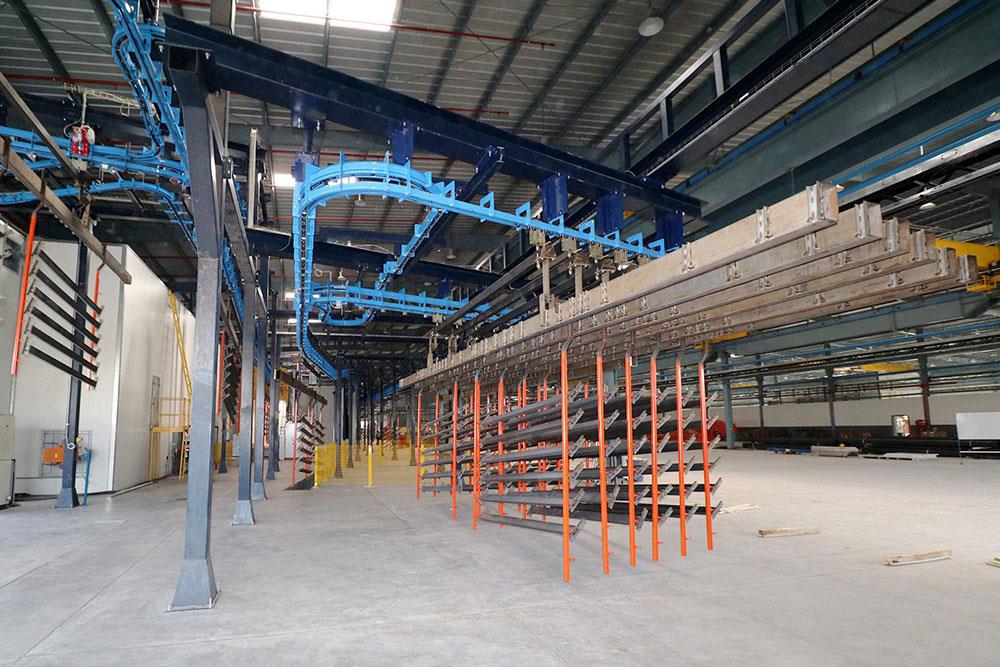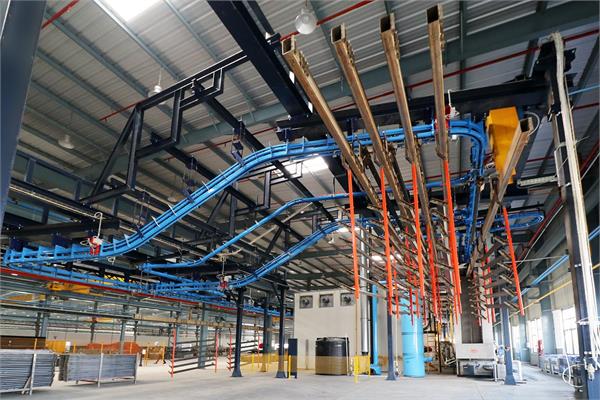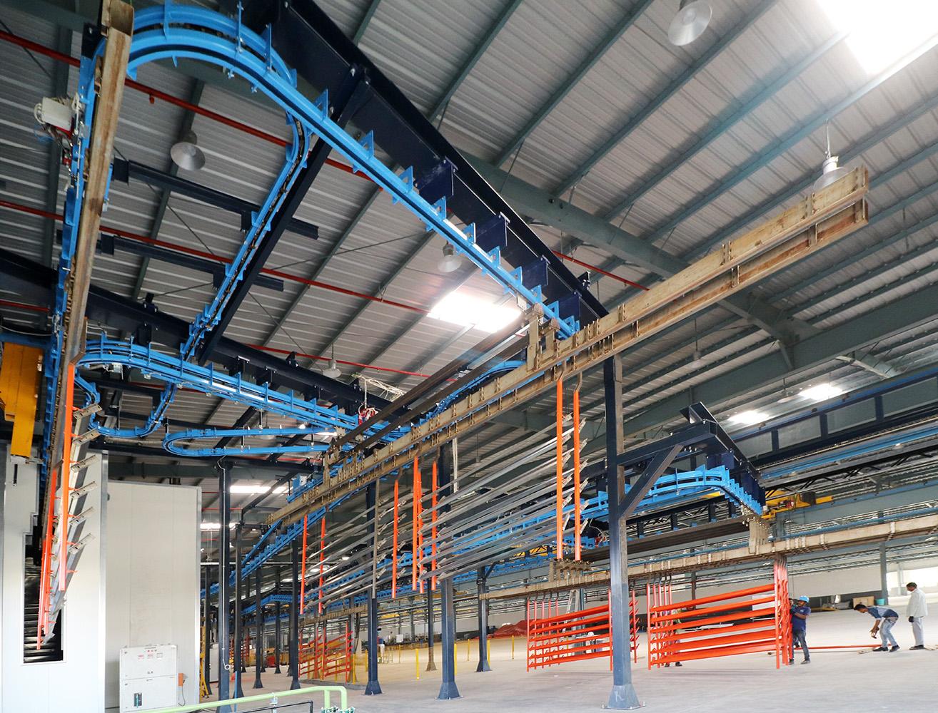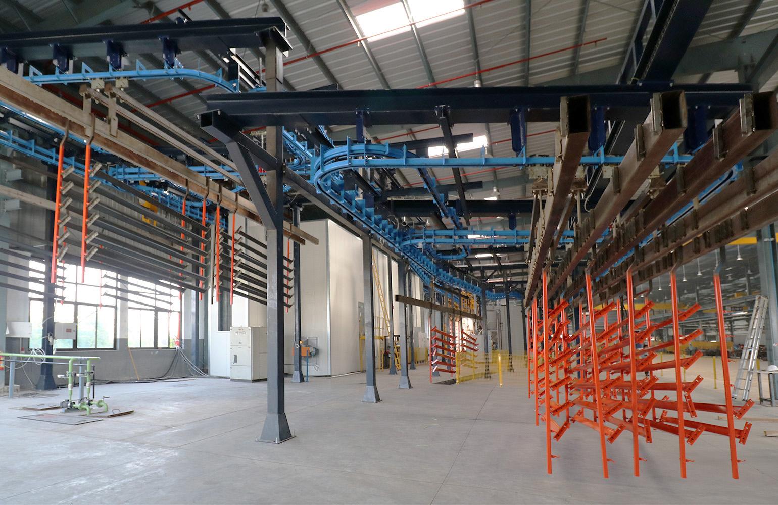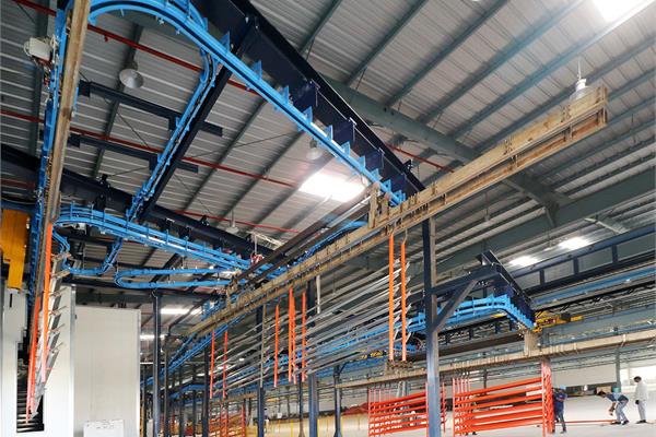 Il convogliatore aereo birotaia power&free XD45/59-02 è stato progettato da CM Automazione per la movimentazione di parti metalliche lungo la linea di verniciatura. L’impianto comprende tre linee di movimentazione (servizio, pretrattamento e finitura) e unità di trasporto lunghe 12 metri, ciascuna con carico massimo di 1.000 daN.