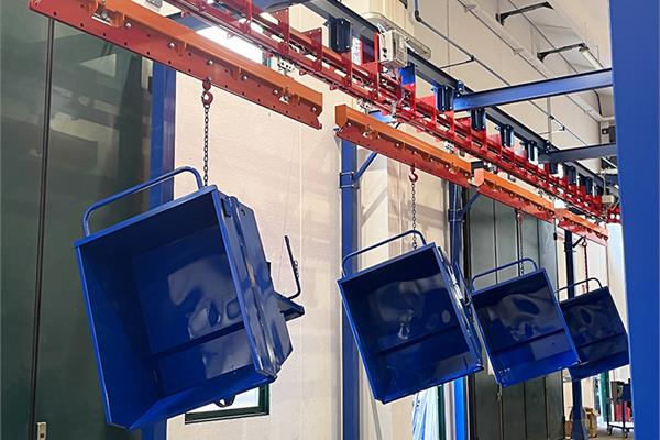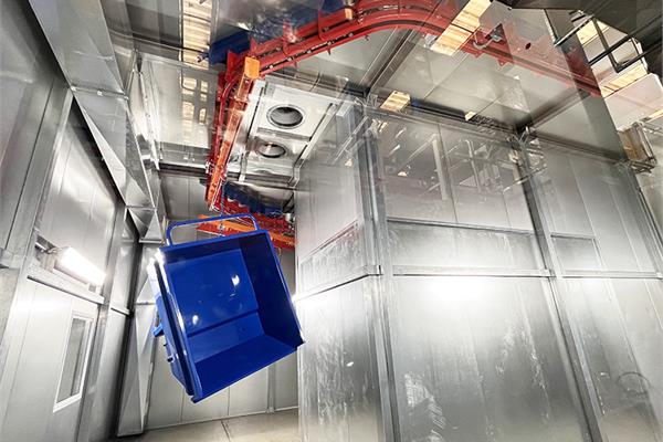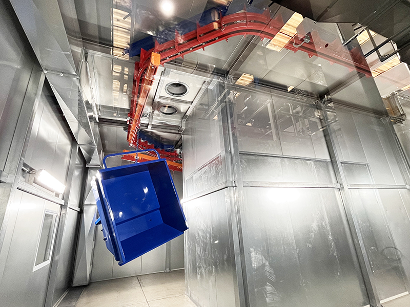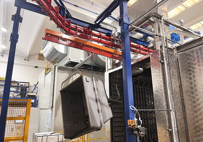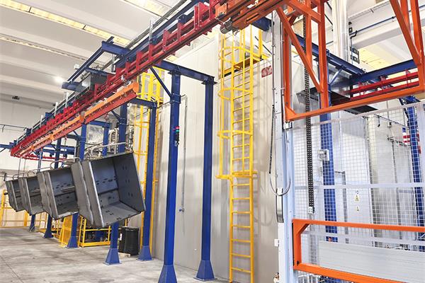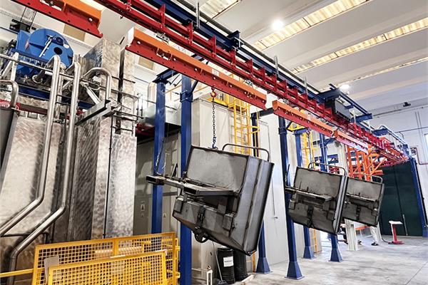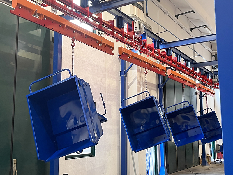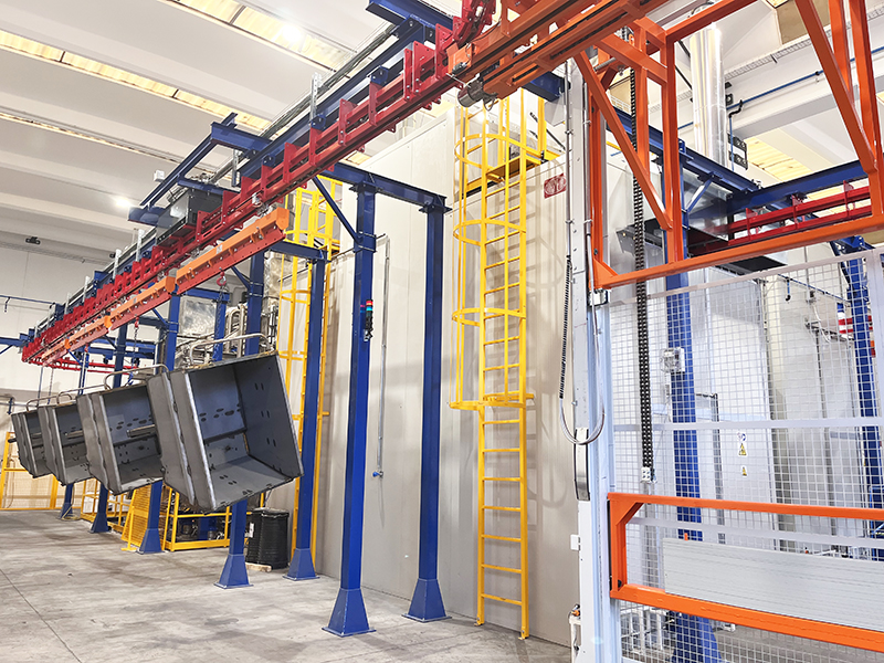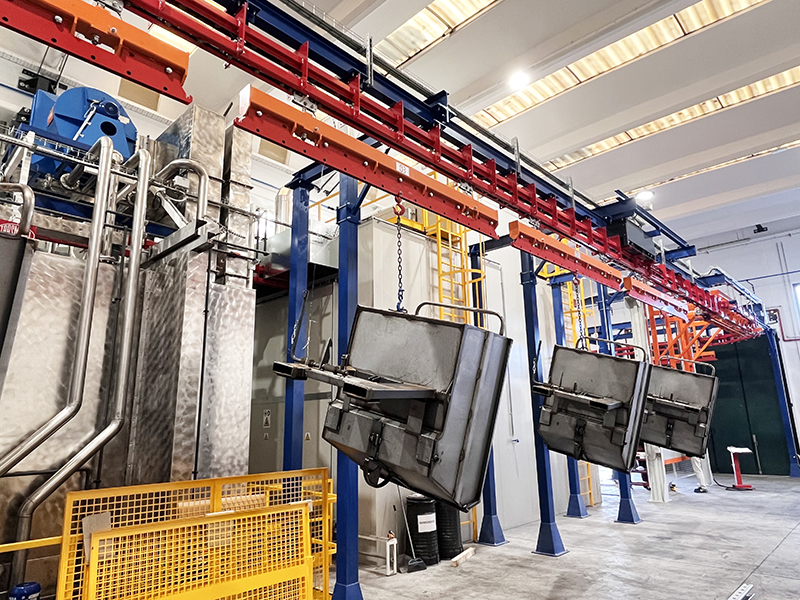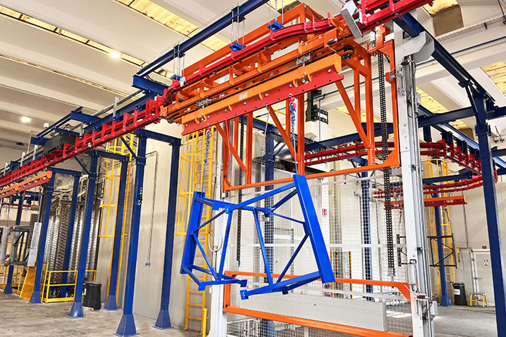 Il convogliatore birotaia P&F XD45/59-03 è stato progettato da CM Automazione per la movimentazione aerea lungo la linea di verniciatura. L’impianto supporta 18 unità di trasporto, ciascuna con carico massimo di 700 daN, garantendo continuità e precisione nelle operazioni.