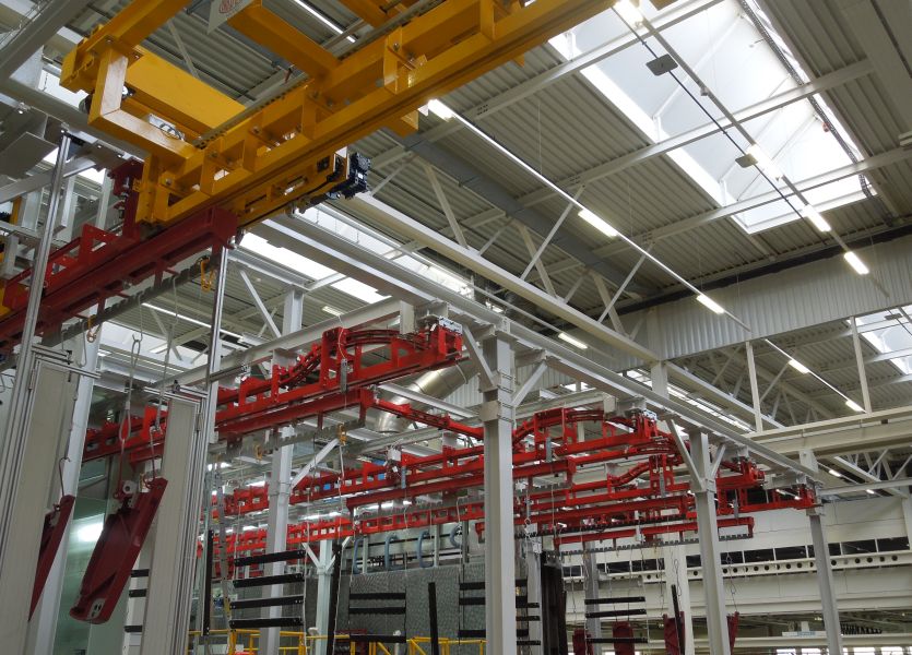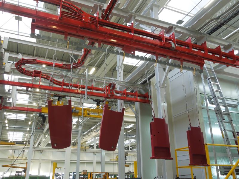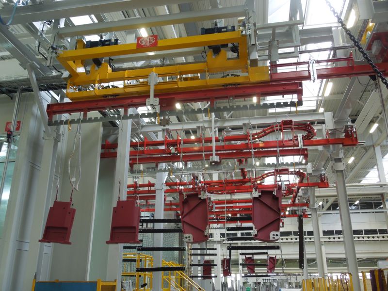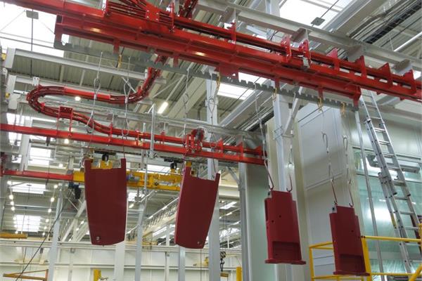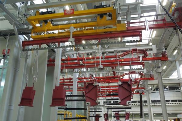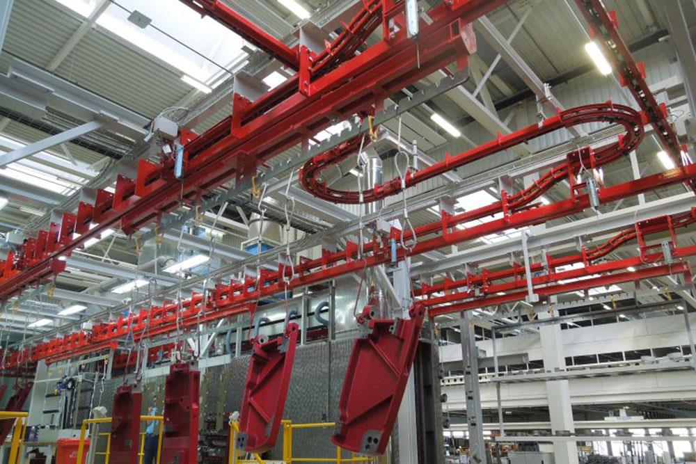 Il convogliatore aereo birotaia power&free XD45/80-01 è stato progettato da CM Automazione per la movimentazione dei telai lungo la linea di verniciatura. L’impianto è dotato di gruppi elevatori con paranchi e di un gruppo traslatore ortogonale per garantire corretto posizionamento e flusso continuo dei manufatti.
